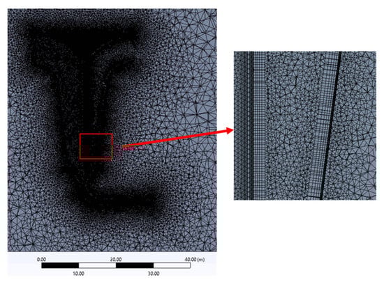 Figure 2 shows a typical flow domain used in the computations. The computational domain used in the ANSYS computations had a size of 70 m length, 50 m width, and 70 m height. The wall function is adopted for the airflow through the system. The air density is considered to be 1.225 kg/m3, and the dynamic viscosity is considered to be 1.81 × 10–5 kg/(m·s). The mesh is decreased in size, until the difference in the results is within 2%. As shown in Figure 3, the flow domain was discretized with a mesh of tetrahedral elements. In total, 2,153,969 nodes and 9,553,863 elements were used for the simulation in ANSYS CFX. Higher mesh resolution was used near the wall regions with inflation layer applied. The boundary condition is chosen as the following: wall-surface body condition is stationary wall, wall roughness is 0.5, and turbulence intensity is 5%. The convergence criterion is achieved when the variation in the speed between successive iterations is 0.1%. A constant input speed field, representing the free-stream wind, was assigned to the entire frontal plane of the flow domain. The magnitude of the speed was set at 6 m/s. The exit plane was assigned as pressure-outlet boundary condition. The reference pressure was assumed to be the atmospheric pressure throughout the domain.