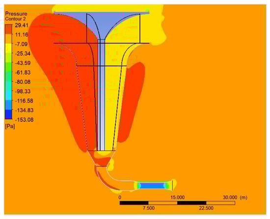 To achieve the optimum wind speed of 20 m/s at the venturi throat of the proposed omni-directional wind-funnel design, it is recommended to have the free-stream wind speed of 7.4 m/s collected at the inlet of the wind funnel. The speed ratio (SR) remains at 2.71 in this case. The velocity profile and pressure distribution results are shown in Figure 12 and Figure 13.