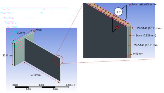 To study the electromechanical coupling piezoelectric materials voltage and power output in ANSYS, the conversion of the material properties of PZT or piezoelectric ceramic-based material is required. Based on the relation of Equations (5)–(7), the compliance matrix, permittivity at constant stress, and piezoelectric-strain matrix in mechanical, electrical, and electromechanical coupling disciplines, respectively, which are usually provided by PZT manufacturers, are converted to stiffness matrix, permittivity at constant strain, and piezoelectric stress matrix, as required by ANSYS. The full material properties are tabulated in Table 4.