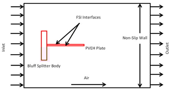 The material properties, as tabulated in Table 3, were used. The boundary of the bluff splitter body model was fixed. The surfaces of the PVEH plate model were set as fluid-structure interfaces, which allow the data exchange of fluid and structure models. FSI simulation results were used to simulate the electrical performance in terms of open-circuit voltage and short-circuit optimal power output under the electromechanical-coupling condition.