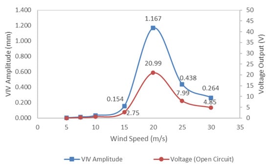 The electromechanical coupling FSI simulation was repeated with a load-resistance condition. The value of the load resistance showed some effect on the vibrational characteristics of the PVEH, including the vibration amplitude and the resonant frequency []. The first resonant frequency has dropped to 76.79 Hz at adjusted optimal load resistance . At 20 m/s wind speed, the vortex frequency of 76.79 Hz is created, and, thus, the maximum power output under this optimal load resistance is generated. It is noted that the VIV amplitude is recorded at 0.351 mm, and the maximum power output at wind speed of 20 m/s is 0.82 mW, with a voltage output of 4.96 V.