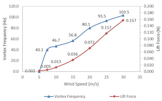 Figure 11 shows that when wind speed increases, the fluctuating lift force acting on the surface of the PVEH plate also increases. It is noted that higher flow speed could induce lower pressure surrounding the region of vortex and produce higher force, which acts on the opposite of the plate’s surface. The vortex is unstable by nature and, when it achieves steady condition, it usually produces a periodical fluctuating lift force with a certain frequency. It is noted that a larger wind speed creates a higher vortex frequency because the alternating lift force is created at higher rate and acts on the PVEH plate. Figure 11 shows that higher wind speeds of 25 m/s and 30 m/s produce a larger lift force, acting on the surface of the PVEH plate. However, the vibration amplitude produced is lower compared with the vibration amplitude produced at an input wind speed of 20 m/s, because there is a mismatch between the vortex frequency created and the resonant frequency of the model. In summary, vortex-induced vibration amplitude is affected more by the vortex frequency than the fluctuating lift force.