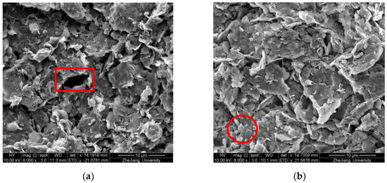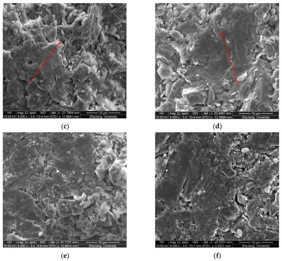 Figure 3a shows that the sample had a flocculation structure before consolidation, and individual particles were spread as debris, aggregates and irregular flake-like aggregates. There was cementation between the particles, but no directionality. Numerous huge pores were discontinuous and isolated (shown as rectangles in Figure 3a). Particle gaps were widely distributed, and the integrity was poor. Figure 3b reveals that, after 30 min of consolidation, there were more flaky joints, fewer large pores and a significant increase in small pores, showing the dispersion of debris and feather flocs (shown as circles in Figure 3b), although the direction was not evident. This is because soil skeleton particles were crushed and broken during the consolidation process, and the large pores were crushed first, resulting in one pore being crushed into two or more. As a result, the medium pores were crushed as well, resulting in fewer medium and large holes and an increase in the number of small pores. As the consolidation time increased, soil samples formed bigger aggregates composed of edge–edge and edge–surface between flake-like structures. Such a trend was in conformity with the study on the evolution of the microstructure of soft clay under consolidation loading conducted by Zheng et al. [41]. As the degree of soil compaction rose, the connection strength also increased, and the arrangement became more ordered (marked as arrows in Figure 3c,d). Over a long period of consolidation, neighboring soil particles approached, aggregated and compacted, and then the microstructure transformed from a skeleton-type overlapping structure to a closed-type flake structure, resulting in an obvious agglomeration event. The connection mode between structural units, which was previously based mostly on edge–edge and edge–surface, shifted to one dominated by surface–surface, and the structure became more stable. Therefore, the compaction effect of the soil was significant at the microscopic scale.