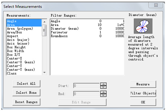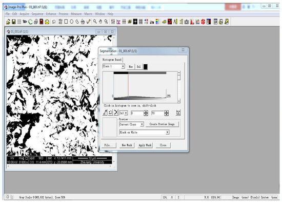In this study, Image-Pro Plus 6.0 (IPP) was utilized for image processing and quantitative analysis. The purpose of image processing was to extract information from the images and output data of pore characteristics for statistical analysis. The processing steps were divided into three: the calibration of the pixel space, binarization processing and automatic software analysis [37]. (1) Firstly, a calibration of the pixel space was required. The experiment of the field emission scanning electron microscope in this study adopted a magnification of 8000 times, allowing a unified pixel space to be used for calibration. (2) Secondly, when converting a grayscale image to a binary image, the setting of the threshold was critical for SEM image processing. Due to the differences in the light and uniformity of gold plating during the photographing, many particles in the images were present in the pores, not just on the sliced surface of the sample. If the threshold was set too high, these particles were regarded as pores, and if the threshold was set too low, some tiny pores near the soil particles were counted as soil particles. As a result, during the binarization process, a suitable threshold must be selected, as shown in Figure 4. After binarization, the white part of the image represents soil particles, whereas the black part represents pores. The color may also be changed according to the requirements. (3) Finally, after binarization, IPP software could identify, mark and obtain the characteristic parameters of the microstructure, and it could count parameters such as the diameter, area, perimeter, shape factor, roundness, etc., as shown in Figure 5.