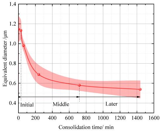 In addition, the change in the average equivalent diameter of pores throughout the consolidation process may be broadly divided into three stages, as shown in Figure 6: (1) At the initial stage of consolidation, with the alternate appearance of aggregation and damage of soil particles, the equivalent diameter decreased slightly. (2) At the middle stage of consolidation, the large pores were compressed sharply and filled with particles, the particles gradually approached, the structure seemed to be connected and the soil became more compact. (3) At the later stage of consolidation, as time passed, the adjustment of particle aggregation and dispersion in the soil slowed down, and the area of the pore approached a constant value. The rate at which the equivalent diameter decreased slowed, indicating that the consolidation process was nearly complete.