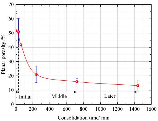 Because of the existence of structural strength, the pores in the soil did not change much during the initial stage of consolidation. Under long-term pressure, the large pores gradually reduced, the curve entered a stable stage with a considerable decline and the plane porosity tended to a certain value. This is because, once the pores reached a certain size, they would no longer be damaged. However, within a particular scale, they gradually compressed, resulting in an area of the pore that was basically unchanged and a porosity that was basically constant [42].
