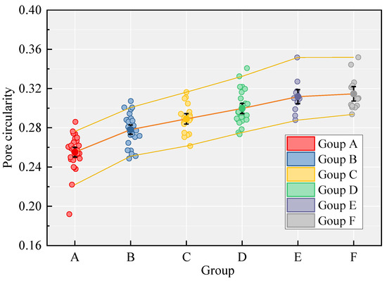 In addition, the authors discovered that, at the initial stages of consolidation, particle damage is greater, and growth is more obvious, whereas at the later stage, particle shape and pore shape are more stable, and the curve is flatter. This demonstrates that recombination and aggregation occur among structural units under the consolidation pressure, and the degree of homogeneity of the pore tends to approach with time [43]. This conclusion is supported by the results of equivalent diameter and plane porosity.