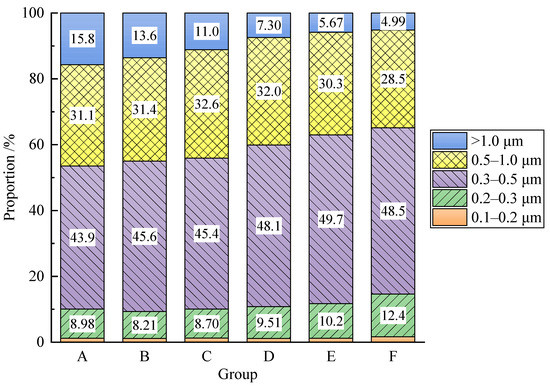 The curve of pore distribution can intuitively and quantitatively reflect the composition and distribution of pores. In this study, for the convenience of analysis, the pores of the soil samples were divided into the following categories: large pores, with diameters of d > 1.0 μm; medium pores, with diameters of 0.5 μm < d < 1.0 μm; medium and small pores, with diameters of 0.3 μm < d < 0.5 μm; small pores, with diameters of 0.2 μm < d < 0.3 μm; and micropores, with diameters of 0.1 μm < d < 0.2 μm. Figure 9 shows the curve of soil pore diameter under different consolidation times.