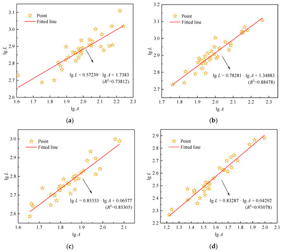 Previous studies have shown that soil particles and pores can be described by the fractal dimension [45,46]. The fractal dimension is used to characterize the distribution of pores and to deeply analyze the deformation features of soil samples under the action of lateral consolidation compression. The area–perimeter method is used for the calculation of the fractal dimension, and its basic principle is as follows: