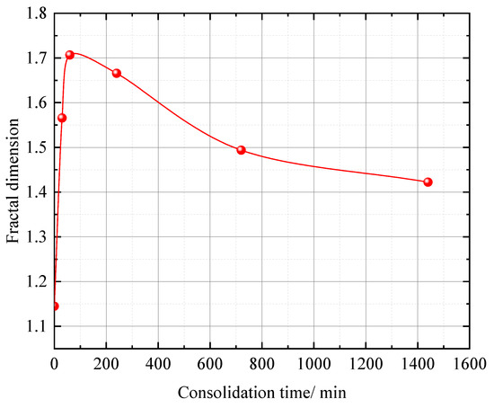 Figure 11 shows the fitted curves of the fractal dimension of each experimental group according to Equation (5). Then, the fractal dimension of each group was calculated, which was plotted against consolidation time, as shown in Figure 12. Figure 12 shows the curve of the fractal dimension of soil pores under different consolidation times. Based on the above microstructure investigation, the curve of the fractal dimensions was also separated into three stages. When compared to before consolidation, soil samples after remolding treatment exhibited good homogeneity and simple pore structures. During the initial stage of consolidation, large soil particles were crushed and divided into small particles, and the development of small soil particles resulted in the formation of small holes between the small particles [41]. At this time, the pore structure became more complicated, and the fractal dimension grew. Then, the soil microstructure began to be reconstructed, and soil particles moved continuously under the action of consolidation compression to adjust the microstructure and to gradually evolve to a new equilibrium state. The fractal diameter of the pores decreased over time. As a result of consolidation, the area of the pores decreased, the shape became smoother, the degree of the homogeneity of the pores rose and the complexity of the pore structure was reduced. At the later stage of consolidation, the change in the microstructure of the soil slowed down, and the fractal dimension of pores varied only a little. The microstructure was restructured and eventually reached a new equilibrium.