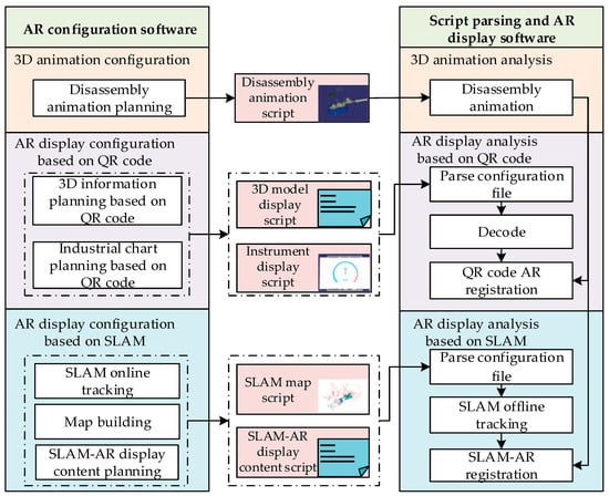 Three-dimensional registration is the core technology of the augmented reality system. It embeds virtual objects into the real scene according to the spatial perspective relationship by capturing the camera image frame and tracking the position and attitude of the camera. To parse the intermediate script files generated in the AR configuration software and quickly realize 3D registration, this study designed the script parsing and AR display software, whose flow chart is illustrated in Figure 8. The system reads the 3D model display script file, instrument display script file, disassembly animation script, SLAM-AR display content script (.yaml), and SLAM map script (.bin) generated in the AR configuration software. Then, it parses the scripts and obtains 3D model display information, industrial virtual instrument, motion parameters of disassembly animation, SLAM-AR display content information, and binary SLAM map. This data information is used to initialize the AR system and realize AR registration.