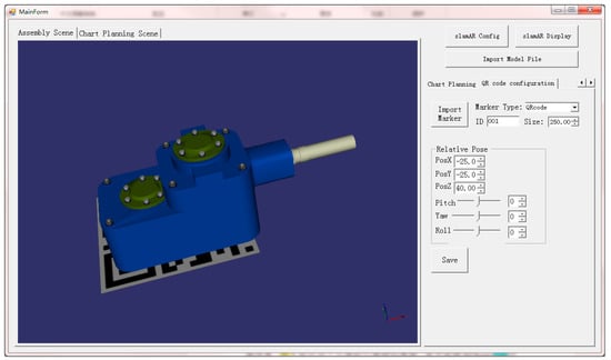 The 3D information display planning unit based on QR code is employed to bind the virtual model or animation with the QR code and set the pose relationship between the displayed content and the QR code. Figure 4 shows the interface of the QR code information planning software; it imports the virtual model into the virtual scene. By configuring the size and number of the QR code and the relative pose with the virtual model, the configuration operation of the QR code and the virtual model is completed, thereby generating the script file for virtual model display.