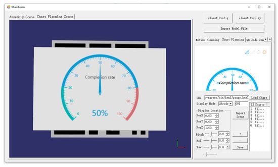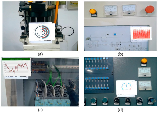 In this study, the instrument display information is configured in the AR configuration software. The AR display function of the industrial virtual instrument is realized by recognizing the QR code in the scene with the script parsing and AR display software. Figure 13 shows the AR display interface of the industrial virtual instrument in the real scene. This interface can display data interfaces such as pie charts, bar charts, line charts, and dashboards according to actual needs. The display content of the instrument interface can be customized by the actual information of the factory equipment. Factory staff only need to be equipped with an AR glass or a mobile device to achieve real-time acquisition of factory information through virtual instruments, thus realizing human-centered industrial data visualization.