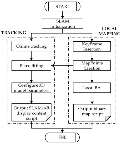 In the online positioning mode of ORB_SLAM2, the tracking thread, local mapping thread, loop detection thread, and AR display thread of the system are synchronized with the optimization task. The tracking thread extracts Oriented Fast and Rotated Brief (ORB) feature points from the image and estimates the camera pose between frames. The local mapping thread adopts the Bundle BA method to optimize key frames and map points. The loop detection thread detects whether the camera returns to the previously visited position and calls the g2o optimization library [39] to eliminate accumulated errors. The AR display thread realizes the AR display by detecting the plane on which the 3D model is placed in the real scene.