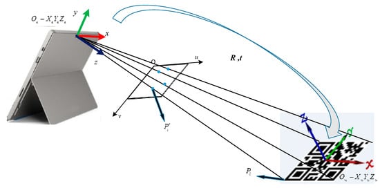 To superimpose information content on the QR code, AR registration is required, i.e., to locate the pose relationship between the QR code and the camera. AR registration method based on QR code can be regarded as a Perspective-n-Point (PnP) problem. PnP is an algorithm for estimating camera pose by the known coordinates of several 3D feature points and their 2D projection coordinates. As shown in Figure 9, the center point of the QR code is the origin of the world coordinate system; is the corner point coordinates of the QR code in the world coordinate system; is the pixel coordinates of the projection of this point in the image. According to the camera imaging model, the following formula is obtained: