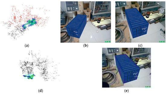 Figure 14 shows a schematic diagram of AR registration based on SLAM map reloading. In the AR configuration software, the user first scans the factory scene through the camera to build a local map. The working mode of the SLAM system is online positioning, and the running frame rate is about 22 Hz. As shown in Figure 14a, the points in the map are displayed in two colors, black and red, where the red color represents the map points observed by the camera in the current frame, and the black color represents the map points that cannot be observed in the current frame. As shown in Figure 14b,c, by recognizing the plane to place the 3D model of the factory equipment, the user can interactively control the rotation, translation, and zoom of the 3D model through the keyboard or mouse according to the actual need. After the mapping is completed, the SLAM map and 3D model parameter configuration are saved as an intermediate script file. In the script parsing and AR display software, the system reads the above intermediate script file to initialize the AR system. As shown in Figure 14d, the system reloads the constructed scene map. At this time, the camera does not observe any points, and all feature points on the map are shown in black. As shown in Figure 14e, the user scans the constructed scene again. The working mode of the SLAM system is offline positioning, and the system runs at a higher frame rate of about 26 Hz. The system relocates through feature matching while parsing the SLAM-AR display script to display the constructed 3D virtual model again.