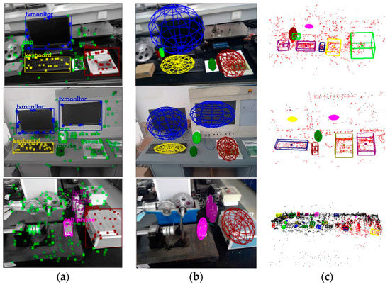 Running results of the object-oriented SLAM system in a real scene: (a) extraction of ORB feature points and YOLOv5 object detection; (b) ellipsoid representation of objects; (c) object-oriented level semantic maps.