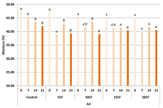 Moisture of the crumb of gluten-free breads with the addition of chestnut flour in the amount of 5% (5CF), 10% (10CF), 15% (15CF) and 20% (20CF) after 7, 14 and 21 days of storage, packed in a barrier film with air. Values marked with the same symbols mean no statistically significant differences (α = 0.05).