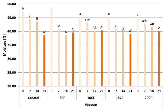 Moisture of the crumb of gluten-free breads with the addition of chestnut flour in the amount of 5% (5CF), 10% (10CF), 15% (15CF) and 20% (20CF) after 7, 14 and 21 days of storage, packed in a barrier film with a vacuum. Values marked with the same symbols mean no statistically significant differences (α = 0.05).