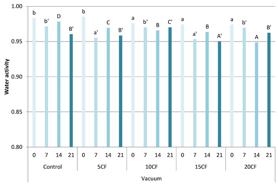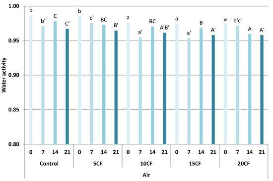 On the basis of the conducted research, it was found that the fresh bread at the zero point was characterized by a higher water activity compared to the bread tested after the given storage time. Water activity in the breads with the 5% and 20% addition of chestnut flour gradually decreased until they were stored. In the case of the control sample, the bread with the 15% and the bread with the 20% addition of chestnut flour, water activity increased after 14 days compared to its level after 7 days of storage. It can be assumed that the reason for this is the separation of free water in the product, which contributed to its evaporation into the environment [38]. The water activity in the analyzed breads packed in a barrier foil with air ranges from 0.956 to 0.983 (Figure 3).