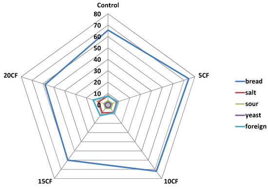 Sensory analysis was carried out by 10 well-trained panelists. A nine-point hedonic scale was used to evaluate the overall acceptability of the bread formulations, ranging from 1 (dislike extremely) to 9 (like extremely) [32]. Samples of the same size were prepared for each panelist. Each assessor received bread samples in an identical form, which were marked in a coded manner and impossible to identify by the panelists.