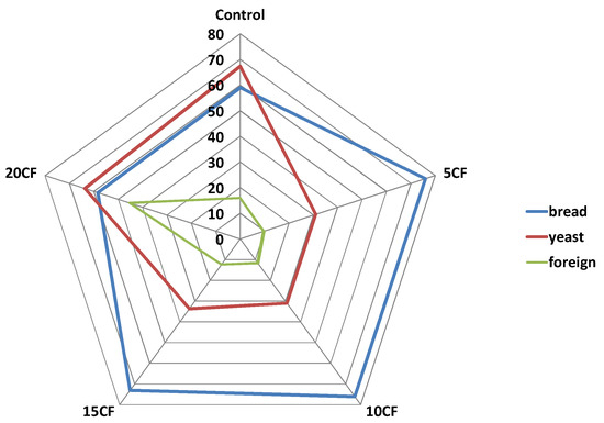 The PCA results (Figure 9b) showed that the analyzed samples can be clustered into four distinctive groups. One of them consists of the control sample. The second cluster contains the breads with the 5% and 10% addition of chestnut flour. The next one contains the bread with addition of 15% of chestnut flour, and the last cluster consists of the bread sample with the 20% of chestnut flour addition.
