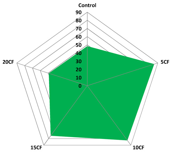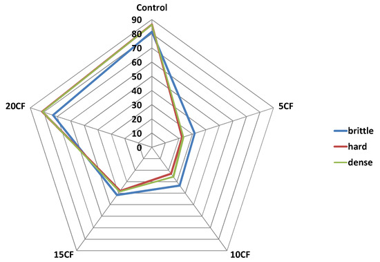 The values of the b* parameter of gluten-free bread crumb ranged from 12.65 (for bread with a 5% addition of chestnut flour) to 15.55 (for bread with a 20% addition of chestnut flour) (Table 3). The lowest share of the shade of yellow in the color of the crumb was found in bread with the 5% addition of chestnut flour (12.65), and no statistically significant differences were found between bread with the 5% and 10% addition of chestnut flour (12.86). The b* parameter values for the control sample and the bread with the 15% addition of chestnut flour were 14.54 and 14.73, respectively. Comparing the obtained values, it was found that, with the increase in the concentration of chestnut flour, the share of the yellow color in the tested breads increases, which was also observed in [39], where the values of the b* parameter were 17.76, 18.47 and 19.14 for loaves with the 15, 20 and 25% addition of chestnut flour, respectively.