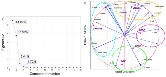 A principal component analysis (Figure 9) of the results of the evaluated bread samples showed that the sample variation corresponds to the first main component (Factor 1), which accounted for 54.97% of the total variability and was related mainly to chewiness, elasticity, cohesiveness, crumb features, browning index, foreign and yeast smell as well as gumminess. The second component (Factor 2) constituted 37.87% of the general variable and was related mainly to tastes (yeast, sour, salt and foreign). Based on the obtained eigenvalues, the analysis can be limited to two factors explaining 92.84% of the total variability (Figure 9a).