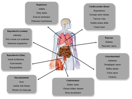 Obesity also causes several complications such as reproductive (women and men), respiratory, cardiovascular diseases, pancreas, and gastrointestinal, as shown in Figure 2.