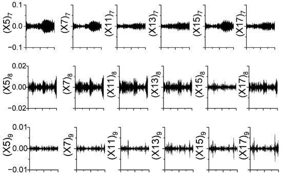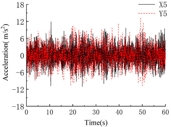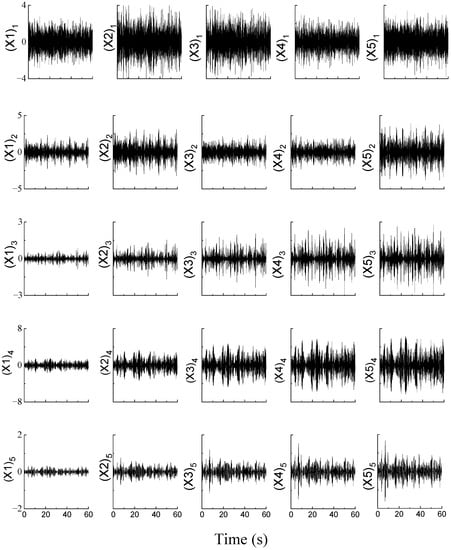 Figure 2 displays the noise-added structural responses of point A5 along the direction of the X and Y axis. The associated noise-added signal at each point is decomposed by the MEMD method and the X-direction results of the first five IMFs are displayed in Figure 3, in which (X1)2 stands for the 2nd IMF of X-direction response of point A1, and so on. Figure 4 shows the time–frequency spectrum using the Hilbert transform, from which the time–frequency distribution and the associated amplitude of each IMFs can be easily figured out. Figure 4b,d show the components with a dominant frequency of 11 Hz and 3.5 Hz, which are corresponded to the second and first sway vibration mode of X-direction, respectively. Subsequently, IMF2 and IMF4 are used for identifying the modal parameters of the X-direction. By repeating a similar procedure, the modal parameters of the Y-direction can be obtained.