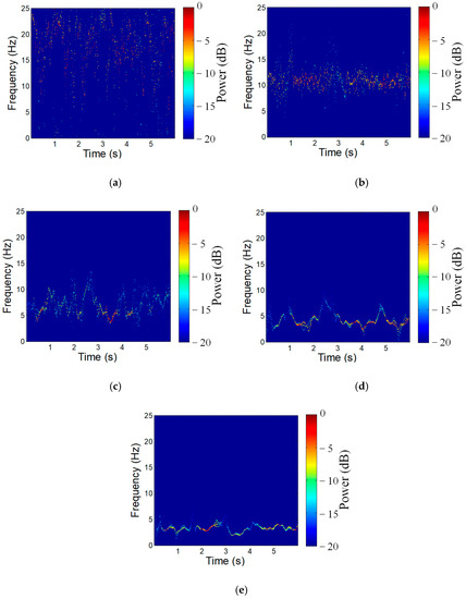 Hilbert spectrum of the first five IMFs. (a) IMF1; (b) IMF2; (c) IMF3; (d) IMF4; (e) IMF5.