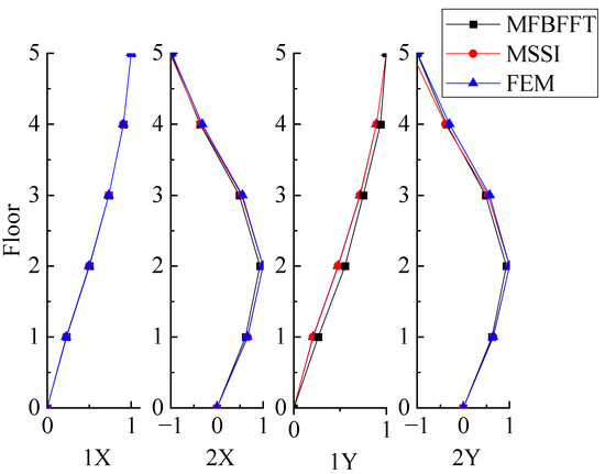 The mode shapes of sway vibration modes are shown in Figure 5. The mode shapes of the frame structure are normalized by making the modal contribution coefficient of the top measuring point A5 the unit. The results in Figure 5 demonstrate that the mode shapes identified by MSSI and MFBFFT methods are almost consistent with that given by the FEM. In order to verify the correlation between the identified and the FEM mode shapes, corresponding modal assurance criteria (MAC) and the normalized modal difference (NMD) [37,38] are calculated as