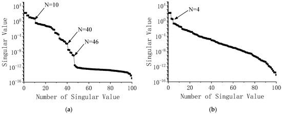 Moreover, system order is an important parameter when performing the SSI method, which is usually determined from the gap of singular value decomposition of the Toeplitz matrix. As shown in Figure 6, it is clearly observed that there lie three significant gaps in Figure 6a when N = 10, 40, 46, and only one when N = 4 when employing the MEMD. Though it is easy to obtain the real system order with the aid of other stability diagrams due to the fewer degrees of freedom in this FEM model, by means of the MEMD method, it can be picked out directly and precisely.
