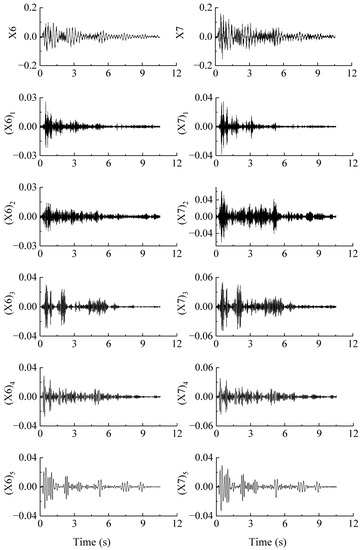 To examine the robustness of the proposed MEMD-based identification methods in seismic excitations, the acceleration response of a 12-storey reinforced frame in shaking table model tests [39] is utilized as a case study. The length scale of the model is 1/10 with an overall height of 3.6 m, beams of 30 mm × 30 mm, and columns of 50 mm × 60 mm, as shown in Figure 7. To measure the dynamic response of the model, more than 61 operating conditions were carried out and 25 channels of accelerometers were instrumented in the model. More information about the shaking table modal was presented by Lu [40]. In this study, the acceleration response of seven channels in X-direction with the sampling frequency of 255 Hz during El Centro excitation is adopted to identify the modal parameters. The original responses and corresponding IMFs of A6 and A7 points are shown in Figure 8. Absolutely, the signals to be decomposed (i.e., X6 and X7 in Figure 8) contain nonstationary features.