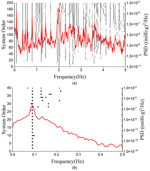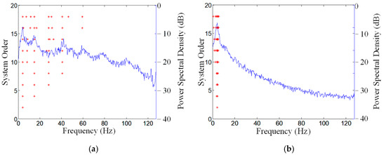 The stabilization diagrams during the SSI method are displayed in Figure 9. Owing to the limited length of the response, the frequency resolution of the power spectrum density function is not high enough, making it difficult to find out the exact system orders as shown in Figure 9a. As for the selected IMFs decomposed by the MEMD method, extra vibration modes are filtered out, leaving only one dominant frequency component as shown in Figure 9b, which indicates a system order of two or four (a result from the remaining noise).