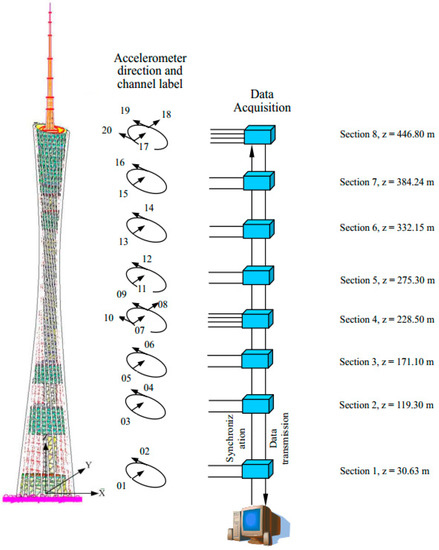 To further validate the MEMD-based approach for a nonstationary process, the acceleration data of the Canton Tower during the Heyuan earthquake are used in the present study. The Canton Tower, a 610 m tube-in-tube structure, was installed with a long-term structural health monitoring system comprised of more than 700 sensors, including 20 accelerometers [41], as shown in Figure 10. Since its constructive period, the monitoring system records rich data on the temperature, wind speed and dynamic performance of the structure during ambient excitation and several hazard events. More details can be referred to in Ni et al. [41,42].