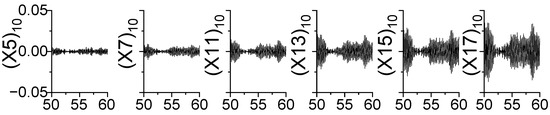The number of the singular values in Equation (5) denotes the system order n. Note that in practical structures, it is quite difficult to determine the system order directly from the singular value of the Toeplitz matrix since the singular values associated with tend to be small numbers rather than zero under the influence of noise. If the selected system order deviates from the required order, the identified results will miss some physical modes or yield some spurious modes. Generally, the stabilization diagram of the identified modal parameters with the increasing order is employed to decide the order of the system to search the stable poles. However, the quality of the stabilization diagram is still highly related to the noise and for the structures with quite close modes, it is still not easy to pick up the exact system order [29,30,31,32]. Thus, the MEMD is deployed as a preprocessing tool, aiming to reduce the effect of noise and obtain a credible system order. For the MSSI method, the multivariate signals are firstly decomposed into several aligned IMFs. Basically, the divided signals contain only a dominant component in the frequency domain, and the majority of the noise is filtered out.