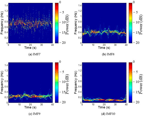 The selected time histories recorded by the X-direction sensors and the Y-direction sensors were decomposed by the MEMD method independently. The vibration modes of Canton Tower are quite complex and close [43], and the original responses are mainly divided into 13 component IMFs in which the vibration modes are not perfectly decomposed. Fortunately, the mode mixing of the selected segment exists only in higher modes which provides a reasonable estimation of the first several modes. Figure 12 and Figure 13 show the time histories and the associated Hilbert spectrum of 7th–10th IMFs. It can be seen that the main frequency ranges from 0.07 Hz to 0.1 Hz. With the aid of power spectrum analysis, it can be inferred that the IMF8 and IMF10 are corresponding to the second and the first vibration mode of the X direction, respectively.
