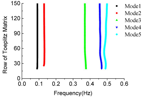 As mentioned before, the row of the Toeplitz matrix plays a significant role in discriminating between the noise and true vibration signal, so the effect between the various Toeplitz matrix row numbers with the modal parameters is taken into consideration as shown in Figure 16, in which each mode is identified separately with the system orders of two, except that the Mode4 and Mode5 are extracted synchronously from the 8th IMF of Y-direction so the system order is decided as four. It can be seen that the frequencies are quite stable with the increasing of the rows of the Toeplitz matrix in the stability diagram.