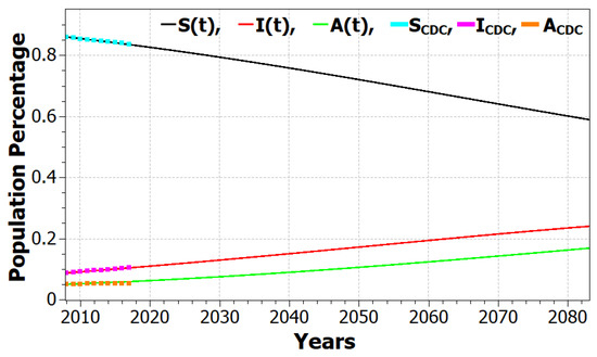As noted earlier, there are multiple parameters that are not well established for the epidemiological models. We have tried to reduce this problem by comparing the results of a simple model with the CDC data, initially without PrEP. Table 1 presents yearly data containing information from CDC case surveillance data related to the estimated high-risk population and infections. These data are used to calculate Figure 1, which plots the normalized percentages for the different categories with projections from our SIA model.