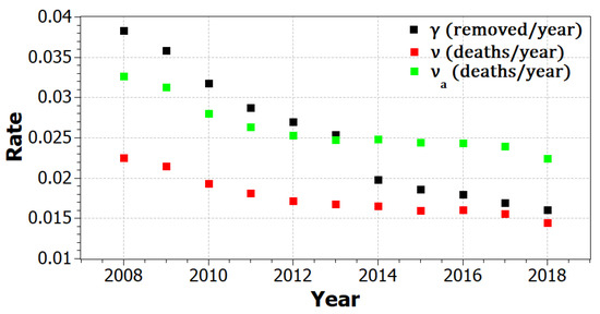 We note that PrEP was introduced in 2012. This information helped determine various rates in our model involving PrEP. Figure 2 shows how several death rates and development of AIDS rate evolved during this period. It is easily seen that the rates in Figure 2 are nearly constant after 2012. Because of this, we simply used the values from 2017 for our parameters in Table 2.