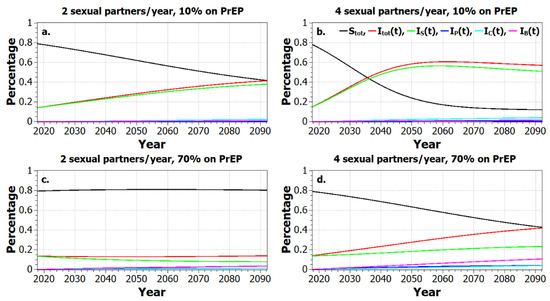 Figure 4 presents the results for the time-dependent populations using the pessimistic case parameters. The plots in (a) and (b) show projections for holding PrEP usage at 10% and changing the average sexual partners per year from two to four. Long-term total infections are 50% for two sexual partners per year and 60% for four sexual partners per year. We do not see a stable set of populations develop as they did before. Again, PrEP usage was set at 70% for (c) and (d). We see in (c) that the increase to 70% PrEP usage for two sexual partners per year leads to the infected compartment decreasing to 38%, still a significant improvement over 10% PrEP usage from (a). However, there is not a significant improvement in infections in (d) for four sexual partners per year over the 10% PrEP usage in (b). There is a redistribution between the subcategories for infected, but the total infected is 59% in both cases.