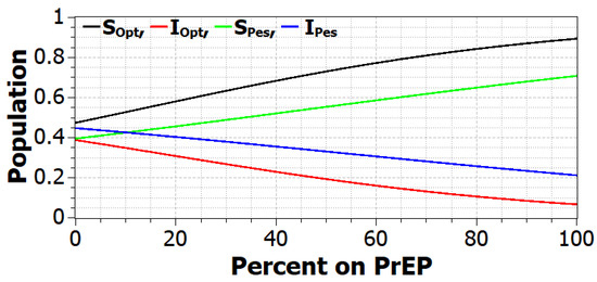 - We calculate long-term populations and outcomes under an optimistic scenario defined as the complete proper usage of PrEP. This scenario utilizes different values of initial PrEP usage and identifies what values of PrEP usage may provide substantial improvements. Our optimistic values are 90% PrEP effectiveness, 91% condom effectiveness, and 99% effectiveness for those using both PrEP and condoms.
