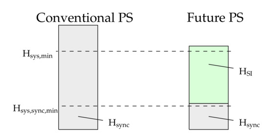 Inertia provided by synchronously connected rotating masses cannot directly be subsituted by SI [5]. The emulated inertial response is delayed due to the measurement of the grid frequency and precise detection of events which demand an inertial response [25]. Thus, to sustain controllability of the grid frequency in power systems with a high share of non-synchronous penetration, sufficient synchronous and non-synchronous inertia has to be provided. For synchronous inertia which responds instantaneously to limit the ROCOF, and non-synchronous inertia which is activated with a time delay after the power imbalance occurrence and synchronous inertia in combination, both provide time to units supplying grid frequency control servives and thus limiting the grid frequency nadir [1,25,26]. This is depicted in Equation (5) and further illustrated in Figure 1, in which is the provided synchronous inertia, is the provided non-synchronous inertia, the minimum required synchronous system inertia and the minimum required system inertia comprising a synchronous and a non-synchronous share. Thus, both requirements being met prevents ROCOF relays from triggering and the disconnection of loads or generation units due to the violation of grid frequency thresholds.