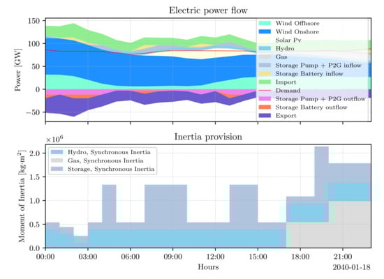 The top subplot in Figure 5 shows the electric power flow results. Until 15:00 of the day, power demand could potentially satisfied by feed-in from onshore and offshore wind turbines as well as photovoltaic system feed-in. However, electric energy is still imported and at the same time exported. Hence, during this time, the German power system is a transit country for electrical energy. Electrical energy is also to a large extent stored in energy storage units such as batteries and pump storage units. By the end of the day, natural-gas-driven generators are dispatched to complement decreasing feed-in from onshore and offshore wind turbines and meet the power demand. During the first three hours of the day, hydro power plants and pump storage units are dispatched with minimum power output. Thereafter, with decreasing wind power feed-in, their output increases, thus resulting in the provided inertia as depicted by the bottom subplot during the first three hours of the depicted day. Thereafter, more units of these categories get connected to the system, which results in more inertia provided. Until 17:00, pump storage and power to gas units get connected to the system for a single hour, explaining the inertia peaks. As soon as gas-fired power plants get connected to the electrical grid, supplied inertia increases significantly.