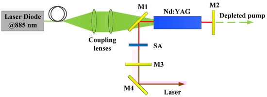 The end-pumping of an Nd:YAG laser using bonded crystals with different doping concentrations through the use of an 885 nm LD has been reported in 2013, for which the optical-optical efficiency was 23% versus the absorbed pump power in the continuous wave (CW) operation, and the output power was 200 mW in the passively Q-switching operation using the Cr:YAG crystal as the SA [22]. The end-pumping of a passively Q-switched pulse train laser with the composite crystal of YAG-Nd:YAG-Cr:YAG through the use of an 885 nm LD has been reported in 2017, for which the single pulse energy was 239 μJ with a pulse repetition frequency (PRF) of 86.3 kHz [23]. However, the end-resonant-pumping of a passively Q-switched Nd:YAG laser using graphene as the SA through the use of a 885 nm LD, with the advantages of a reduced thermal effect and a higher conversion efficiency, has not been reported yet.