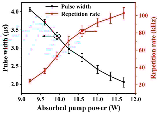Figure 3 shows the pulse width (full width-half maximum) and PRF depending on the absorbed pump power in the Q-switching operation. When the absorbed power was close to the threshold of 9.21 W, the pulse width was 4.06 μs, and when the absorbed power was 11.7 W, the pulse width reduced to 2.06 μs. The PRF increased from 24.7 kHz to 102.7 kHz, corresponding to the absorbed power of 9.21 W to 11.7 W. The pulse width and PRF depending on the absorbed pump power were approximately linear.