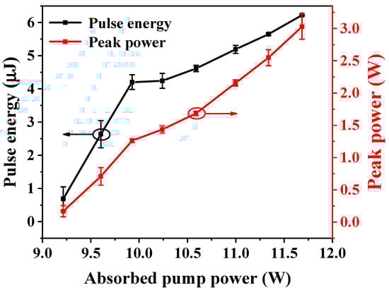 Figure 4 shows the relationship between the single pulse energy and peak power vs. the absorption pump power. When the absorbed pump power was at its maximum, 11.7 W, the single pulse energy was also at its maximum of 6.2 μJ, corresponding to the peak power of 3 W.