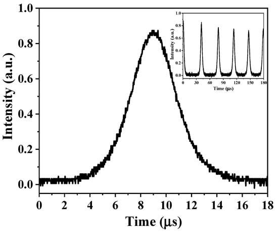 Figure 5 shows the pulse profile when the absorbed pump power reached the threshold. The pulse width was 4.06 μs and the illustration of Figure 5 shows the corresponding pulse sequence. When the absorbed pump power reached 11.7 W, the pulse width decreased to 2.06 μs.