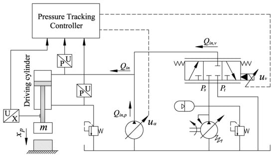 Electrohydraulic systems are currently utilized extensively in a variety of industrial and transport applications [1,2,3,4,5,6], e.g., construction machines [7], robot manipulators [8], load simulators [9], and steering systems [10]. Hydraulic pressure control performance is critical in particular situations, e.g., tunneling boring machine thrust force control and hydraulic press forming force control. In general, two kinds of hydraulic system configurations are used for these applications. One feasible method is to regulate the supply flow to the cylinder chamber by using an electrohydraulic servo/proportional valve [1,11,12,13,14,15], which enables satisfactory dynamic behavior. Another approach is to regulate flow using a variable flow pump; this solution offers better energy efficiency [16], but the system bandwidth is restricted by the response speed of the pump, in which the moving parts’ inertia is much larger than that of the servo/proportional valve.